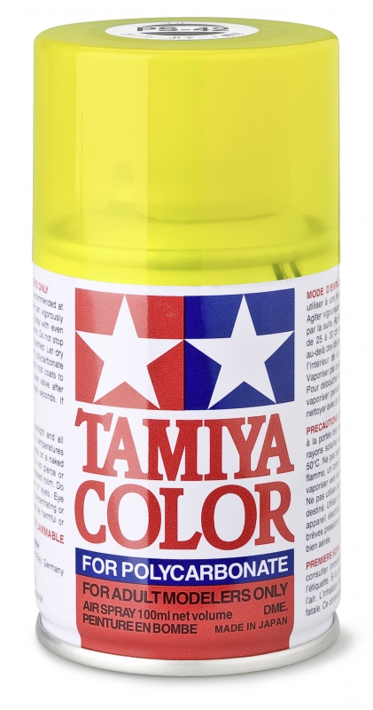 TAMIYA PS = Polycarbonat "Lexan" Sprayfarben sind speziell entwickelt, um unlackierte Bausatzkarosserien zu lackieren. Zahlreiche Farbtöne stehen zur Auswahl und erlauben die individuelle Gestaltung von Modellen. Jede Dose enthält 100 ml Farbe, die Öl- und Kraftstoffresistent sind, dies erlaubt den Einsatz auch an Nitro-Modellen.